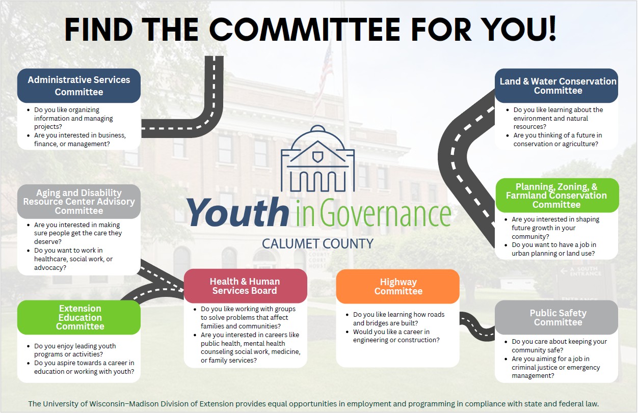 The following are brief descriptions of each of the eight Calumet County Board Committees that youth are able to join. It does not encompass the full scope of their tasks and work. Ask the Committee Chair for a more in-depth description of the committee.
